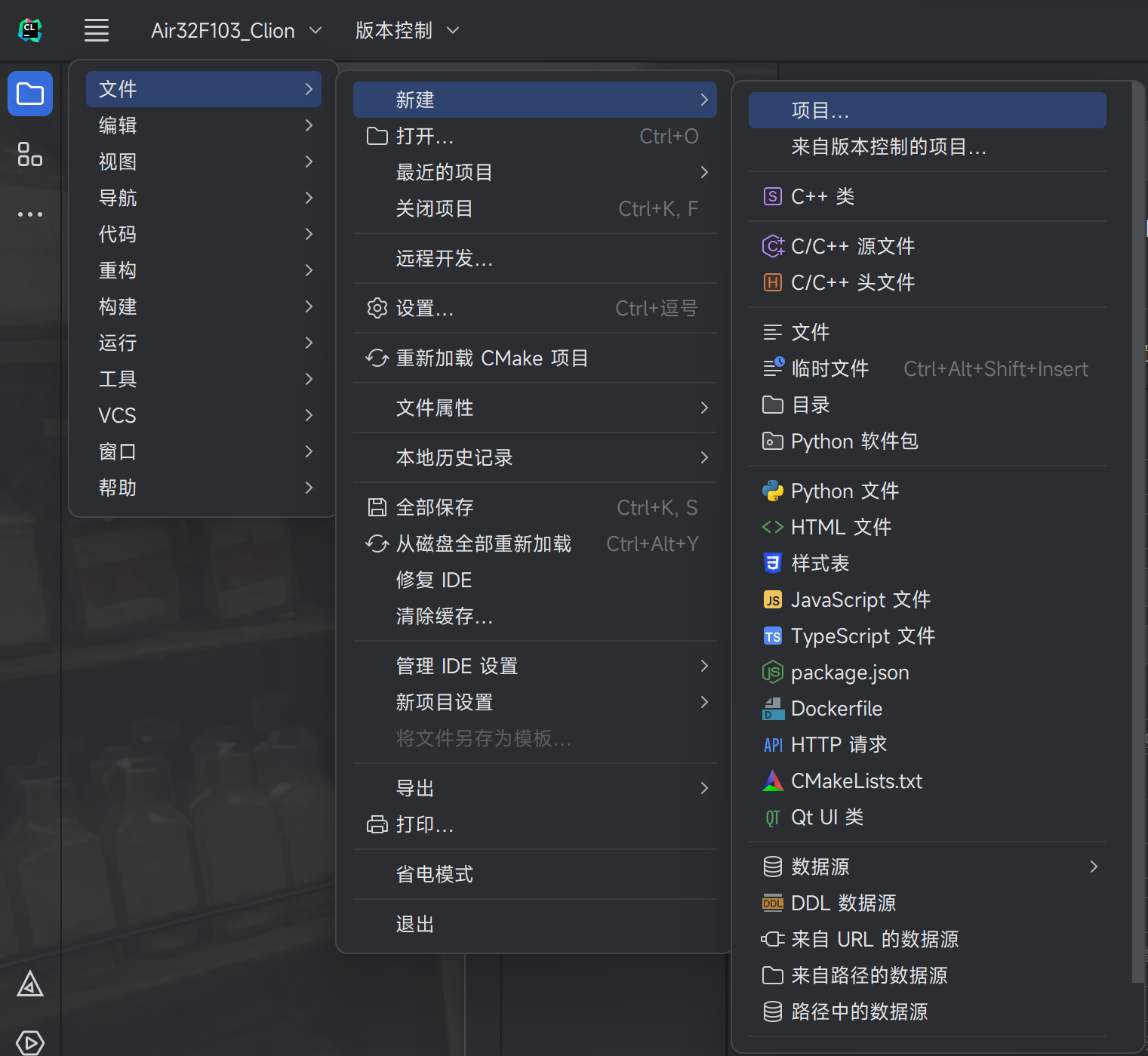 打开 Clion 软件,点击左上角的☰-文件-新建-项目按钮