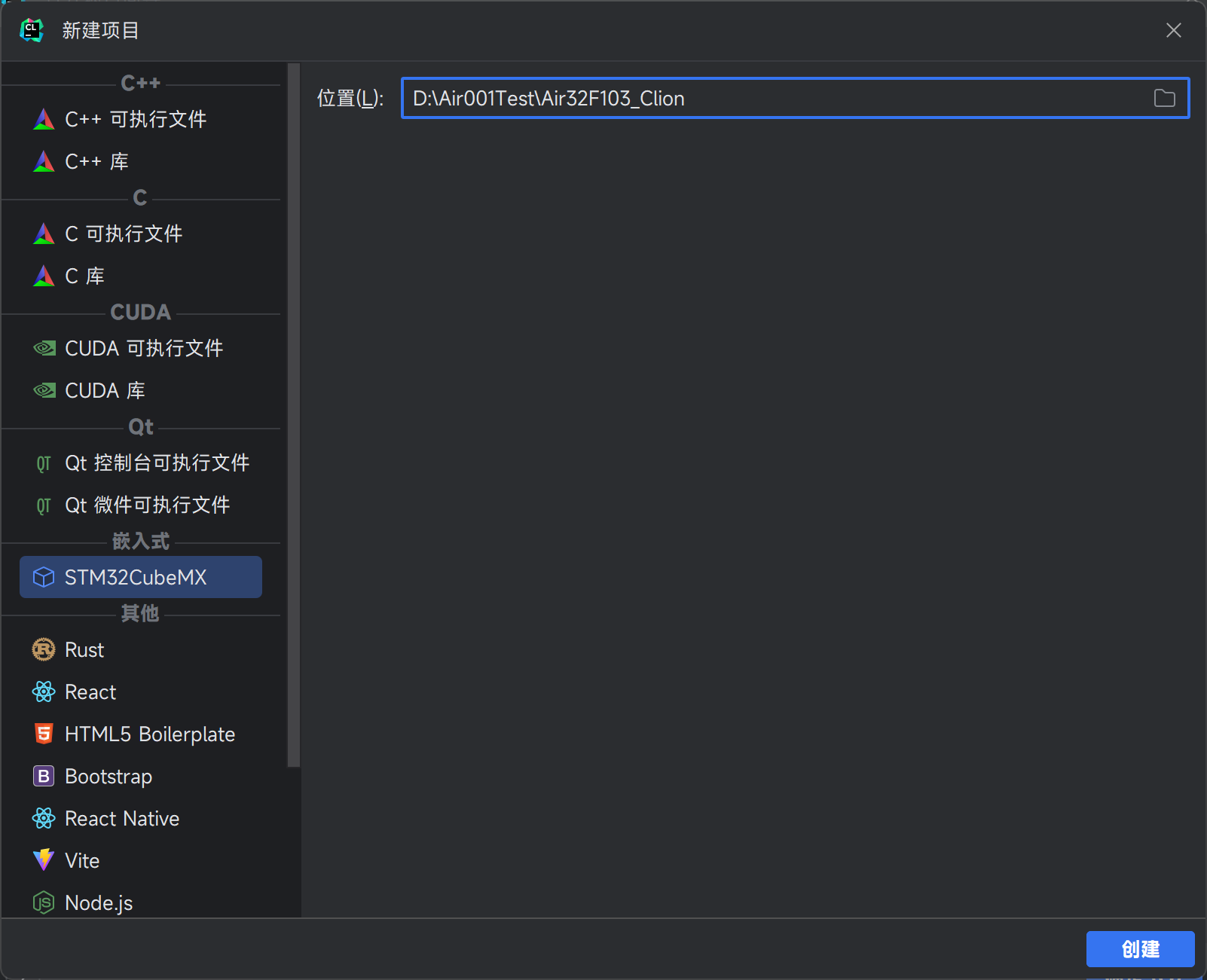 选择左边嵌入式列表中的STM32CubeMX,路径自定