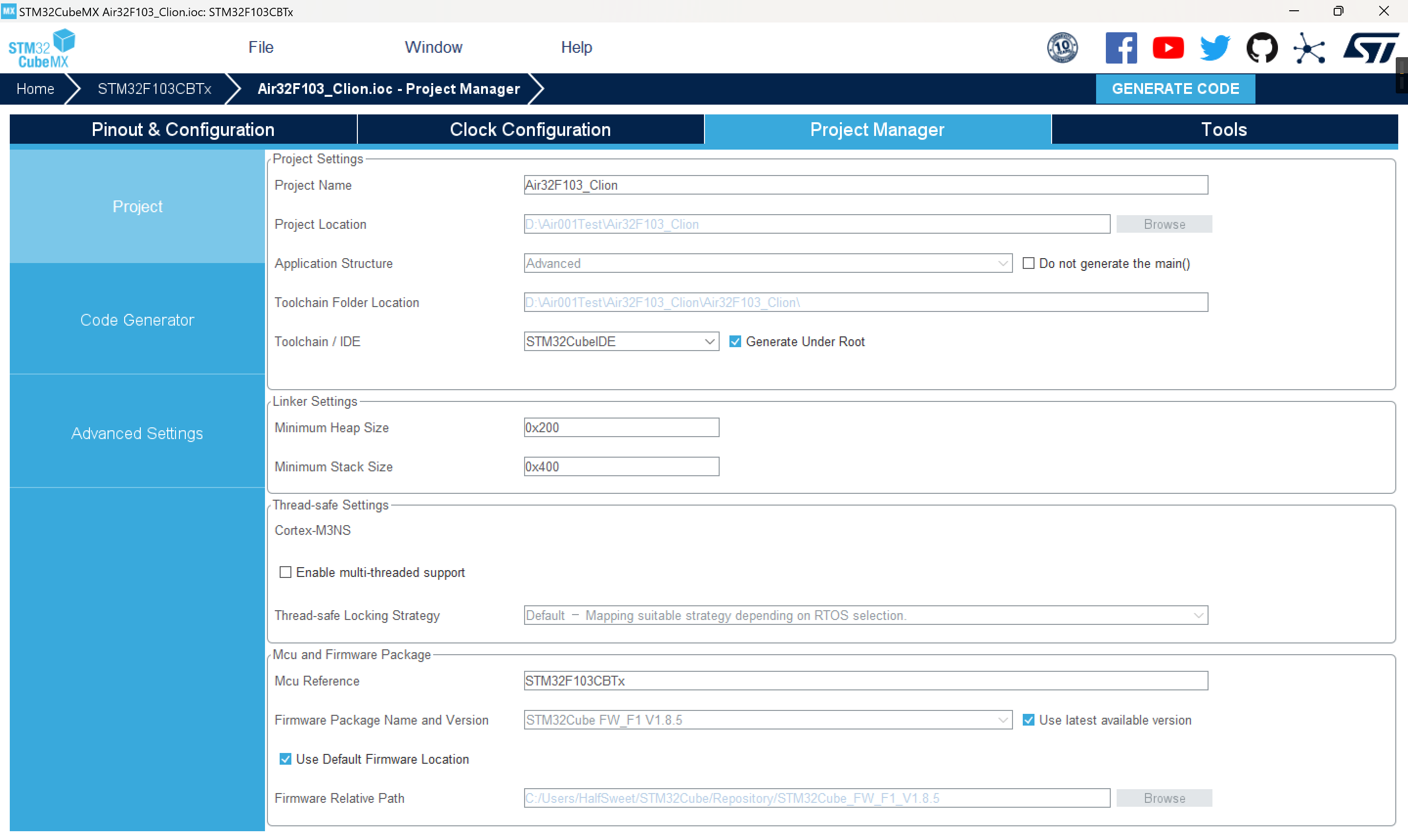 生成代码的时候,在Project Manage中的Toolchain / IDE中选择STM32CubeIDE,注意检查路径是否正确