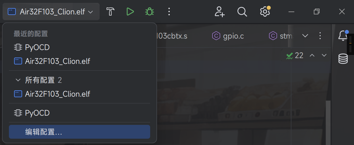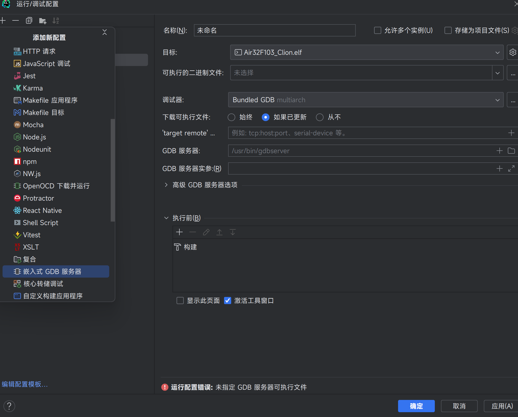点击运行/调试配置按钮,然后点击编辑配置,点击弹出窗口的左上角的+按钮,选择嵌入式 GDB 调试器