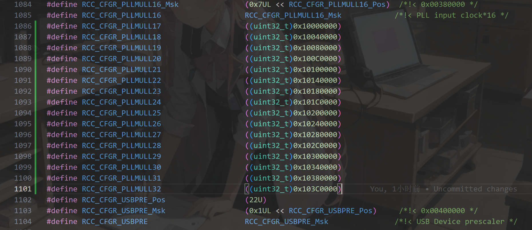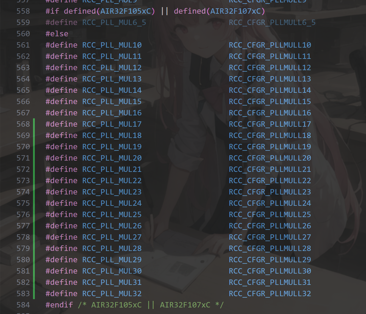 因为我们要跑高主频,原先的 PLL 倍频数不满足,用到了新的一些配置,因此我们需要修改芯片头文件以及hal_rcc_ex.h中的一些宏定义,首先是芯片的头文件,我们这里以air32f103xb.h为例,我们需要修改的地方如下