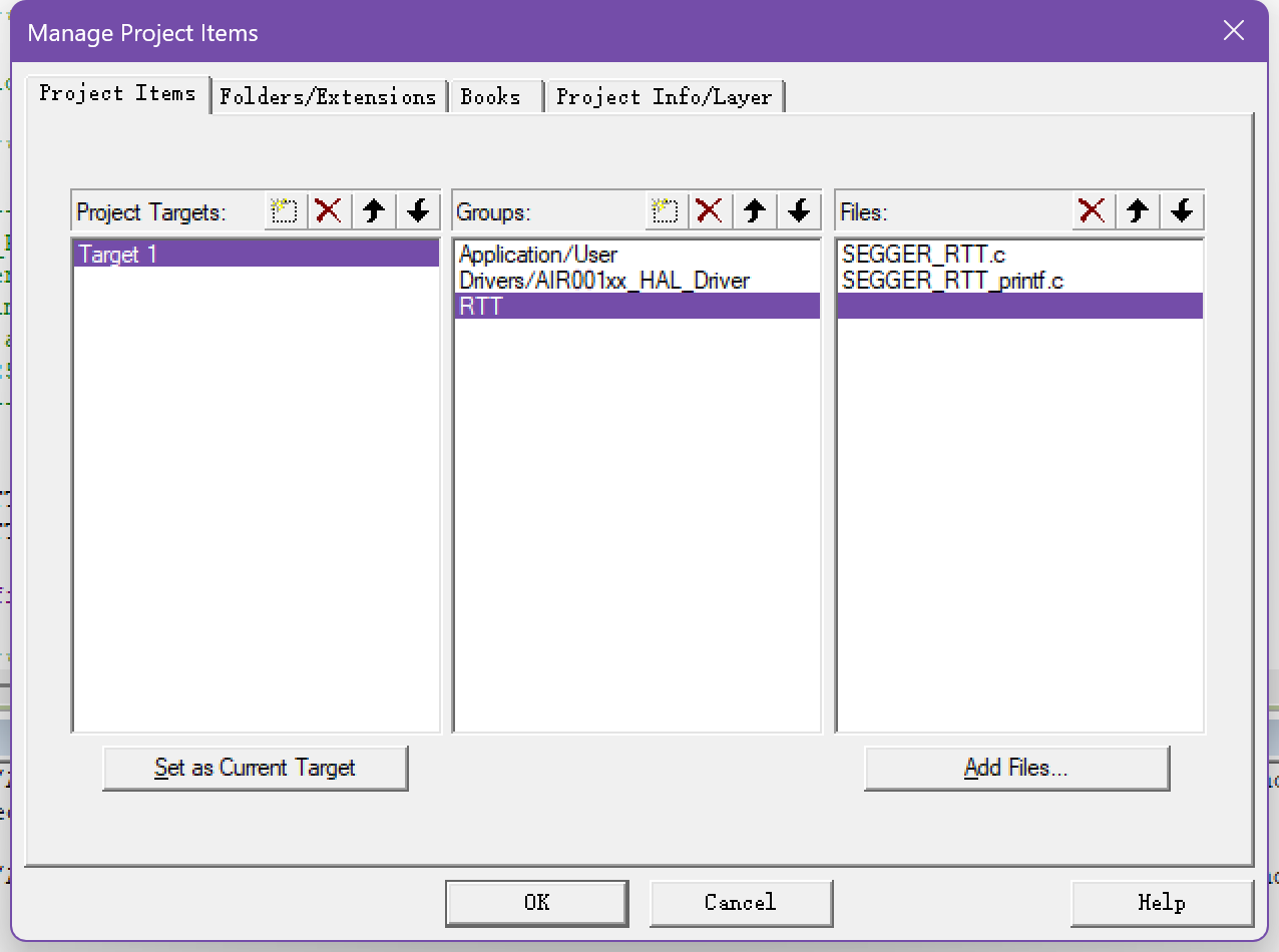我们将xxx/JLink\Samples\RTT\SEGGER_RTT_V788a\下的RTT和Config文件夹复制到我们的工程目录下,并加入到Keil工程中,别忘了添加头文件。