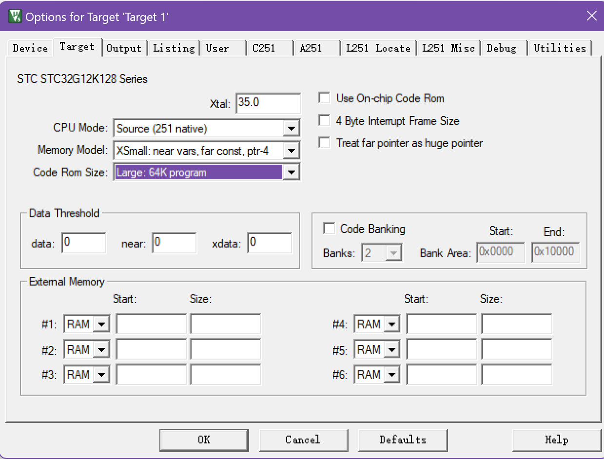 可能需要注意的是,您需要修改 keil 中的Memory Mode,将其修改为XSmall,Code ROM Size修改为Large