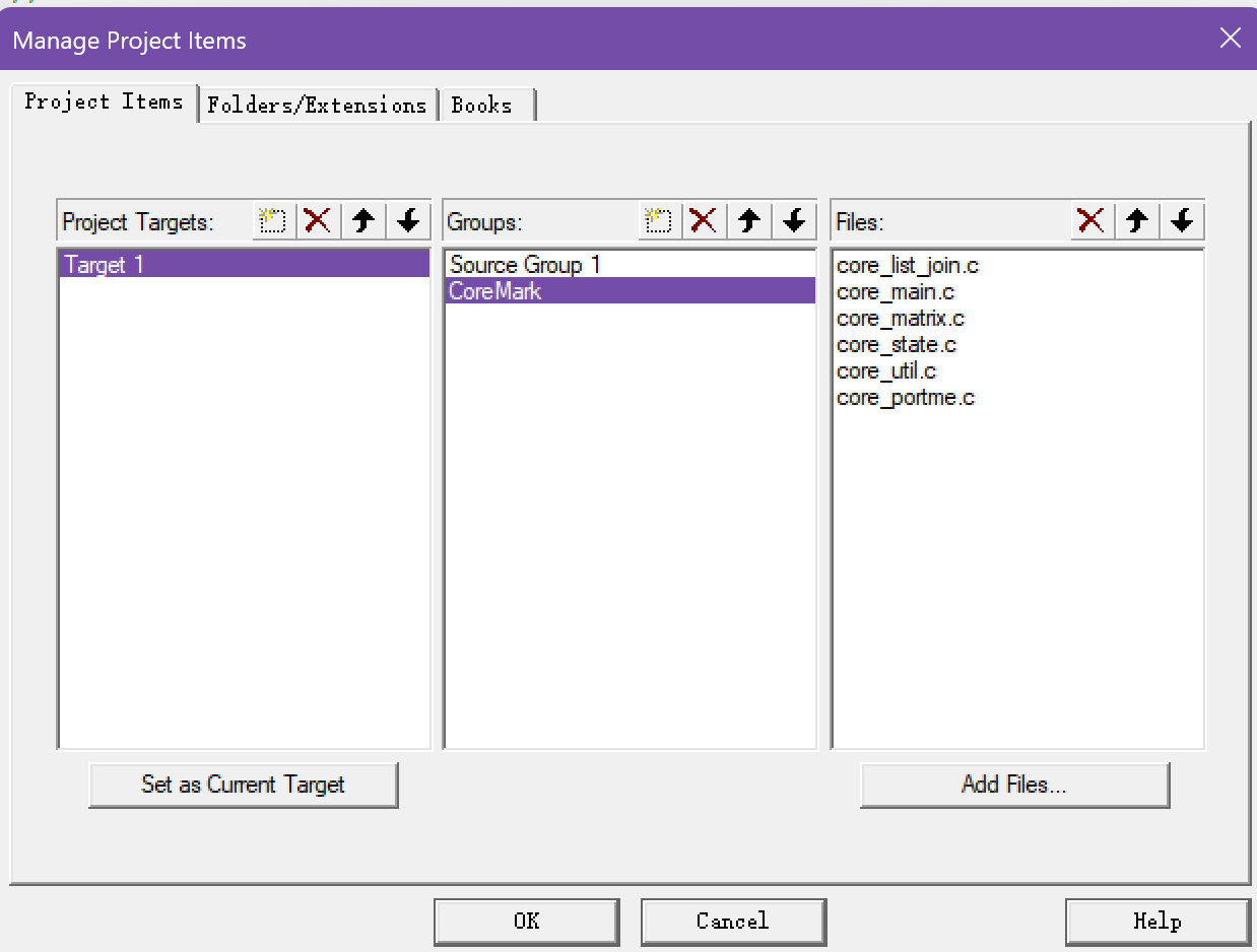 git clone https://github.com/eembc/coremark.git在 Keil 中加入所需的文件