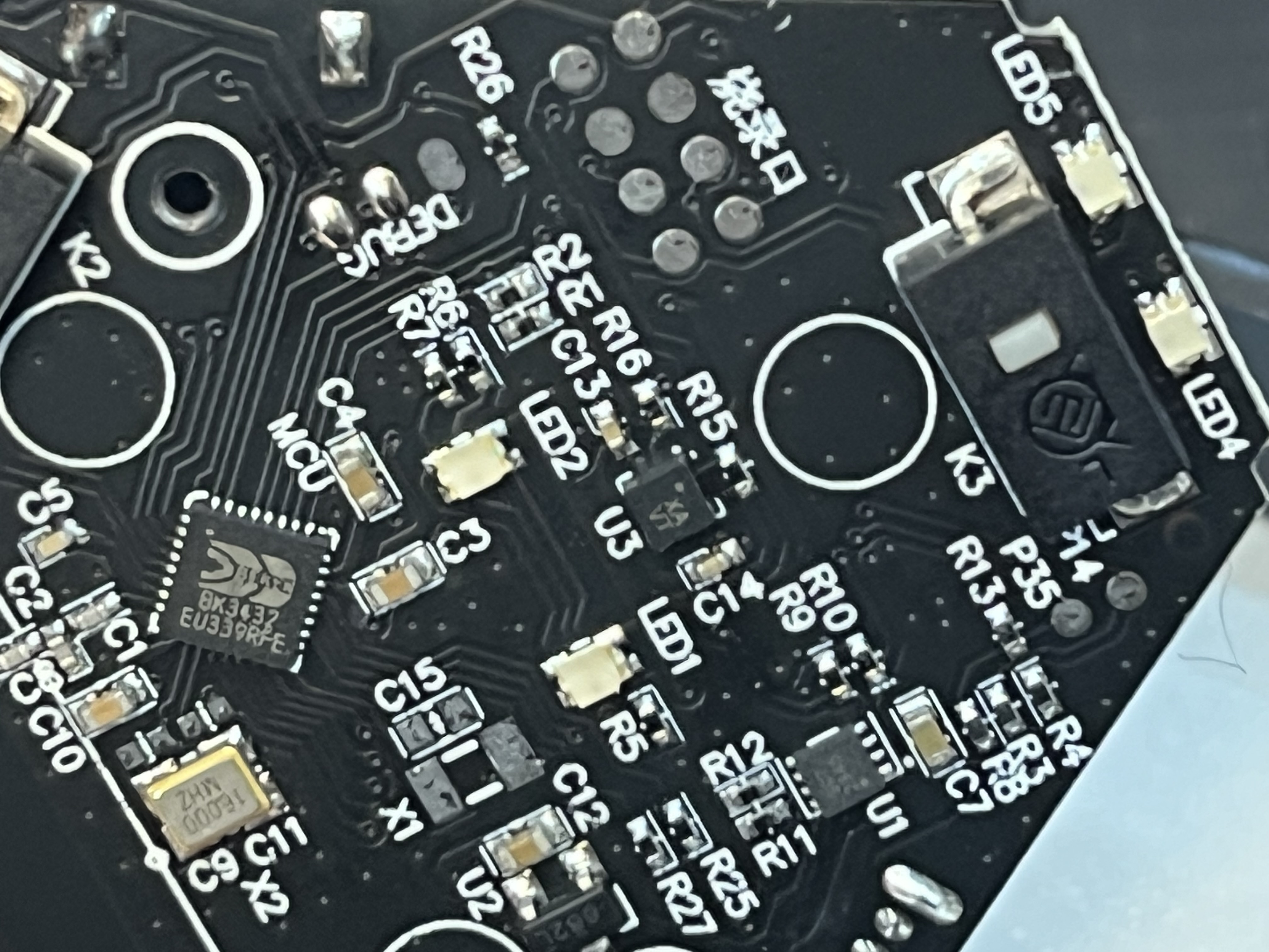 主控使用的是上海博通的方案,具体的型号为BK3432。支持双模蓝牙和 2.4G 的通信。但是值得注意的是它的内置 ADC 仅仅只有 10bit,对于官方宣称的可以使用 Type-C 的 CC1 进行外部电压检测功能来说,ADC 的性能可能会造成一些玩法上的限制。