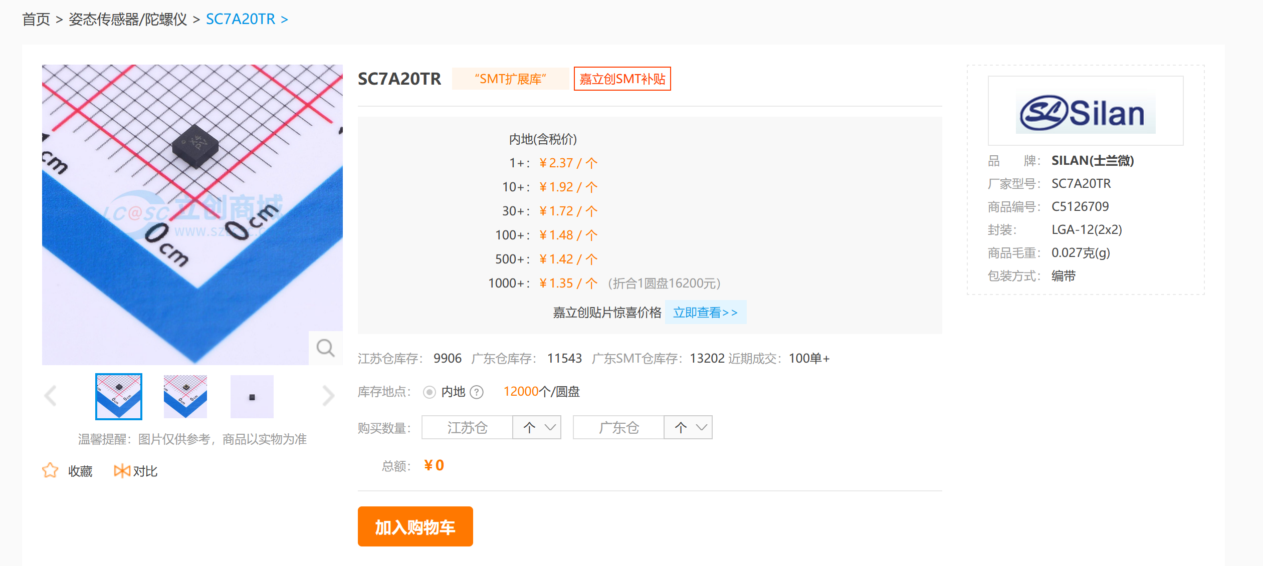 根据芯片的丝印分析,IMU 使用的应该是SC7A20,这个方案的优势就是成本非常的廉价,在淘宝上大部分的售价均在一元人民币左右。当然缺点嘛……就是它至少一个普通的 3 轴加速度计,不支持角速度,也不支持陀螺仪的相关功能。使用的拓展性势必会造成一定的限制。